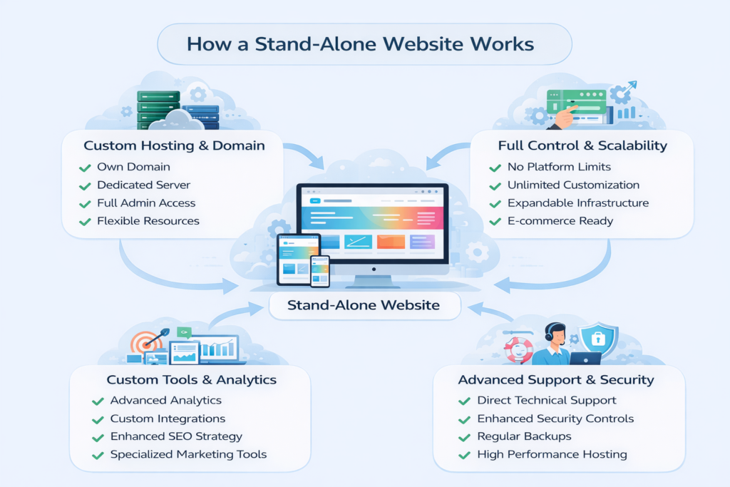 A stand-alone website is a fully independent, professionally built business website created for companies that want complete ownership, control, and long-term flexibility. This option is ideal for established or actively operating small businesses that are ready to manage their own digital presence without ongoing platform dependency.